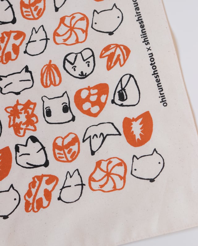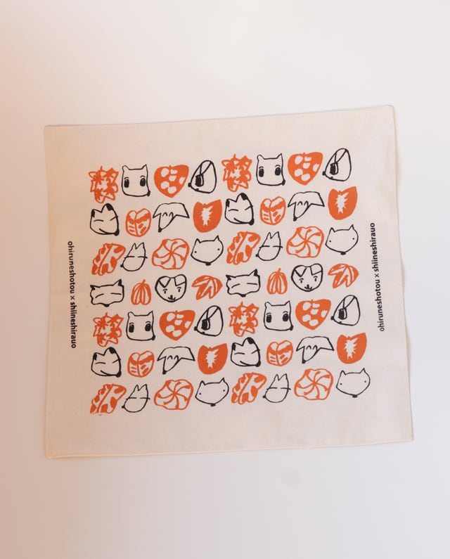 シルクスクリーン印刷で仕上げた綿のハンカチです。葉っぱと犬がかくれんぼしてそうなかわいいデザインです。イラストは椎猫白魚、デザインと制作はおひるね諸島が担当しております。
